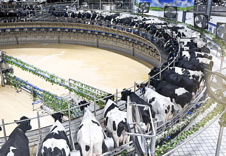 2025年7月28日拍攝的呼和浩特市伊利敕勒川生態(tài)智慧牧場擠奶車間。