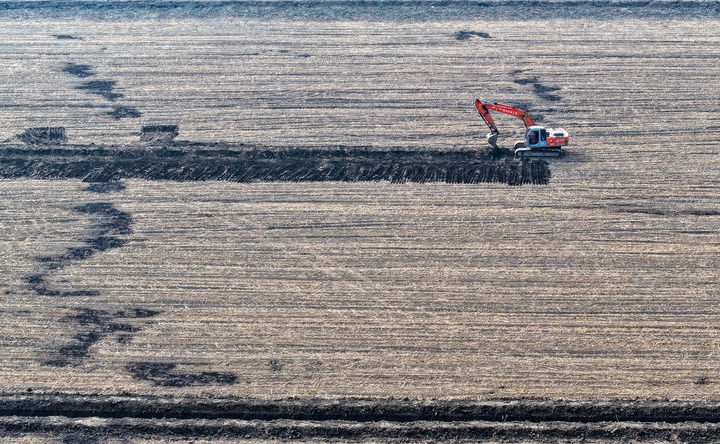 2025年3月11日,在天津市津南區(qū)八里臺鎮(zhèn)大韓莊村,工人駕駛挖掘機(jī)進(jìn)行高標(biāo)準(zhǔn)農(nóng)田施工作業(yè)(無人機(jī)照片)。