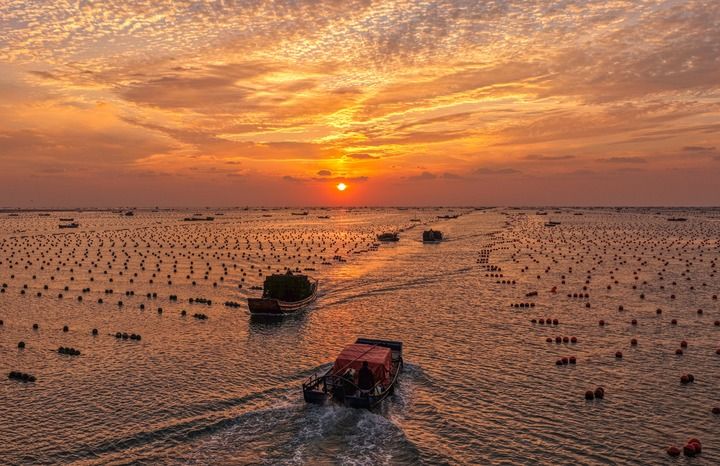 2025年10月24日,在山東省榮成市愛倫灣鮑魚養(yǎng)殖區(qū),收獲鮑魚的養(yǎng)殖戶駕駛船只返回漁港(無人機(jī)照片)。
