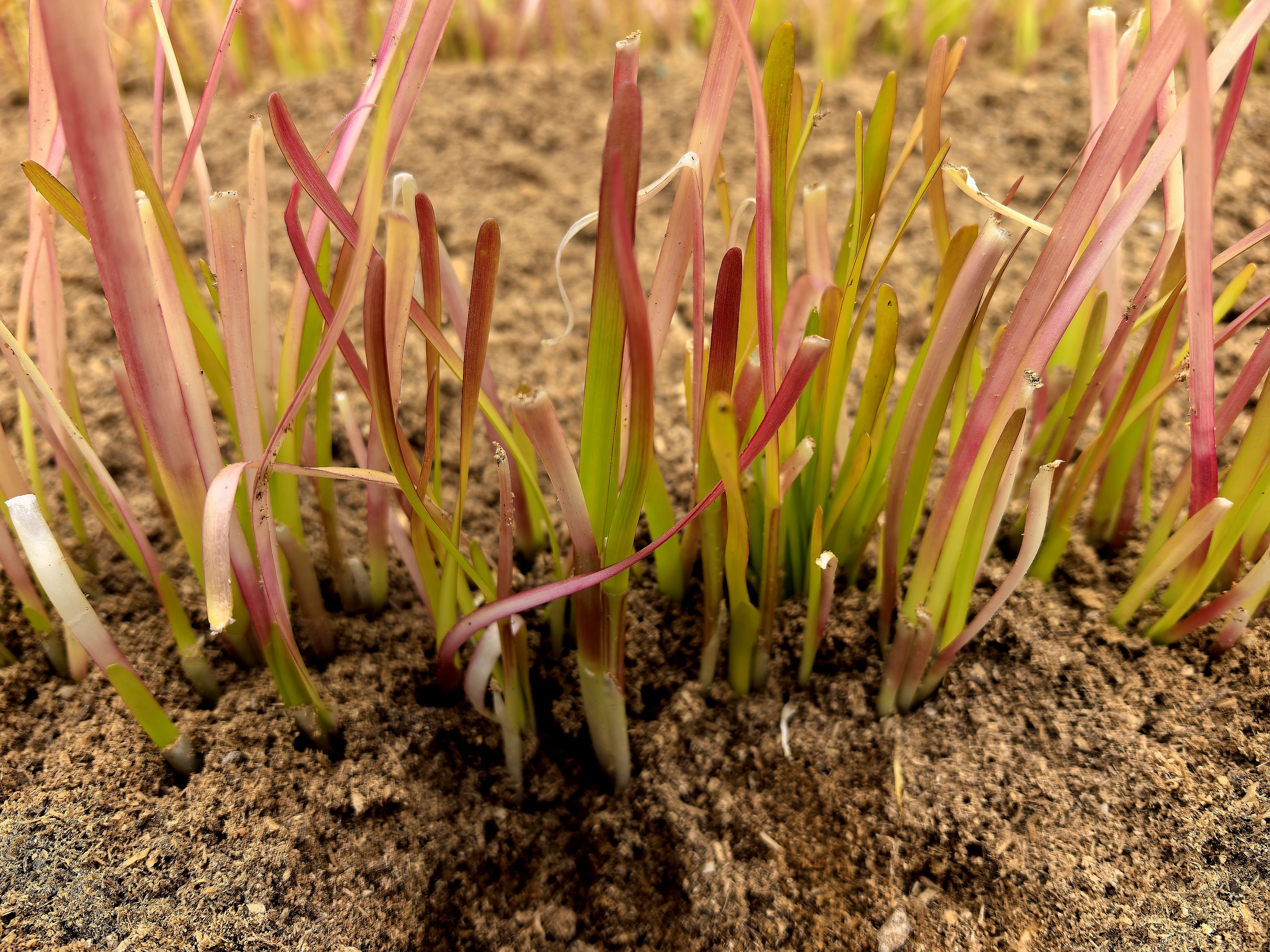 這樣的顏色并非品種天生,而是產(chǎn)于一套復(fù)雜細(xì)致的栽培技藝。在冬季,用特殊的基質(zhì)層層覆蓋韭菜地,精細(xì)調(diào)控掀蓋的時間、厚度來控制溫度和光照條件,使其在不同植株部位呈現(xiàn)出豐富的色彩。