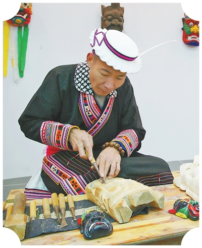 田虎塔在制作曹蓋面具。圖為本報記者宋豪新攝