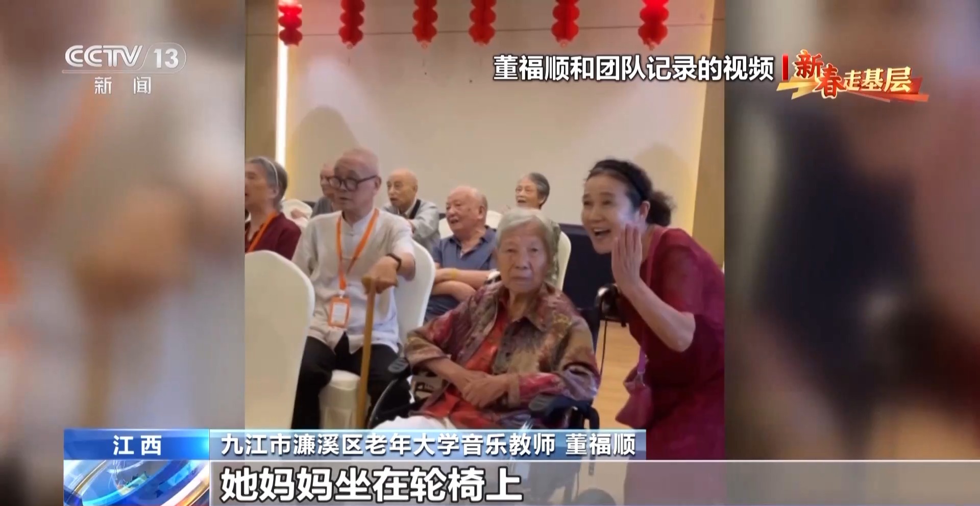 九江市濂溪區(qū)老年大學音樂教師 董福順:這個孩子,她媽媽坐在輪椅上,孩子扶著輪椅,在給她媽媽揮手,打著拍子去一起把這首歌唱完。