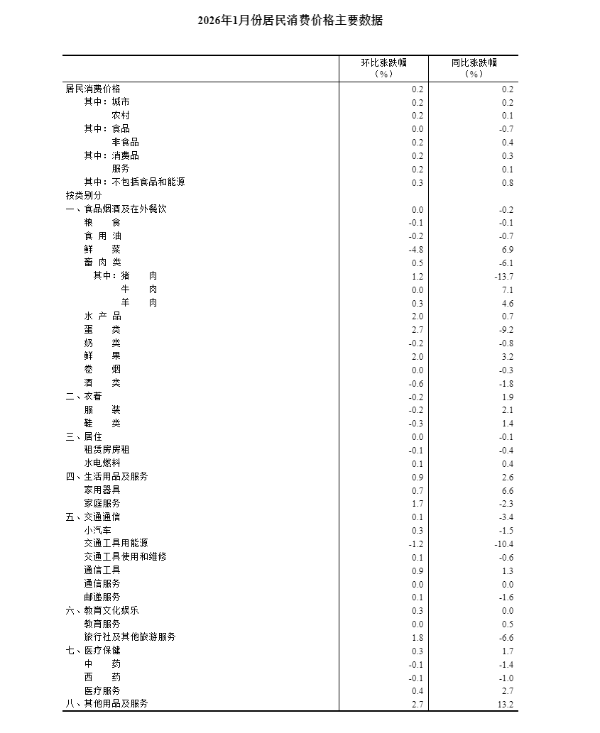 2026年1月份,全國居民消費(fèi)價格同比上漲0.2%。其中,城市上漲0.2%,農(nóng)村上漲0.1%;食品價格下降0.7%,非食品價格上漲0.4%;消費(fèi)品價格上漲0.3%,服務(wù)價格上漲0.1%。