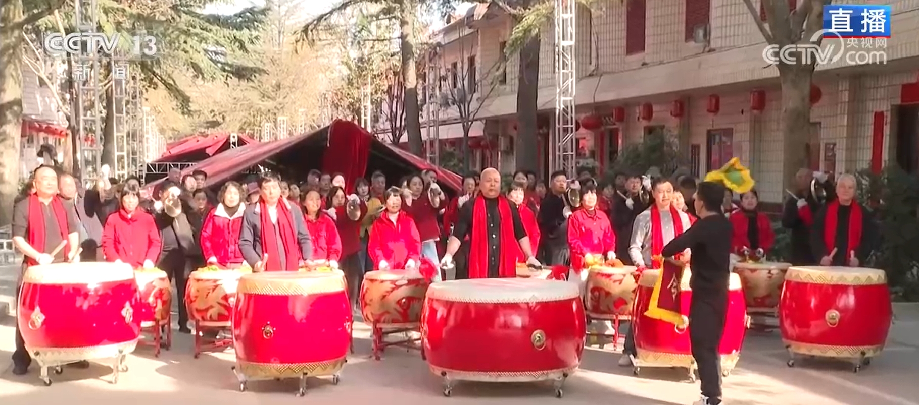 總臺記者 張恩雨:此刻,我是在袁家村的村口,同時(shí)也是村里百人鑼鼓隊(duì)表演的現(xiàn)場。在陜西關(guān)中農(nóng)村地區(qū),每年過年每個(gè)村子都會(huì)有這樣的鑼鼓表演,村民們告訴我,鑼鼓聲一響,年就到了。大家可以看到,我身后的鑼鼓隊(duì)隊(duì)員們是激情昂揚(yáng)、氣勢如虹。這些鏗鏘有力的鼓點(diǎn),正是關(guān)中地區(qū)非常有名的曲目《秦漢戰(zhàn)鼓》,沒有繁復(fù)的花腔,而是重在力量和氣勢。特別值得一提的是,這支隊(duì)伍里年齡最大的已經(jīng)75歲,最小的只有26歲,而且所有人都是零基礎(chǔ)的村民,僅僅集中學(xué)習(xí)了10來天,就呈現(xiàn)出了今天這樣的氣勢。