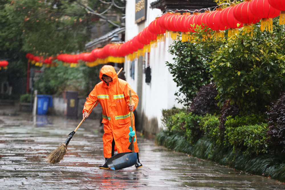 ↑ 2月16日,在浙江省湖州市德清縣乾元鎮(zhèn),環(huán)衛(wèi)工人冒雨清掃街道。新華社發(fā)(倪立芳攝)