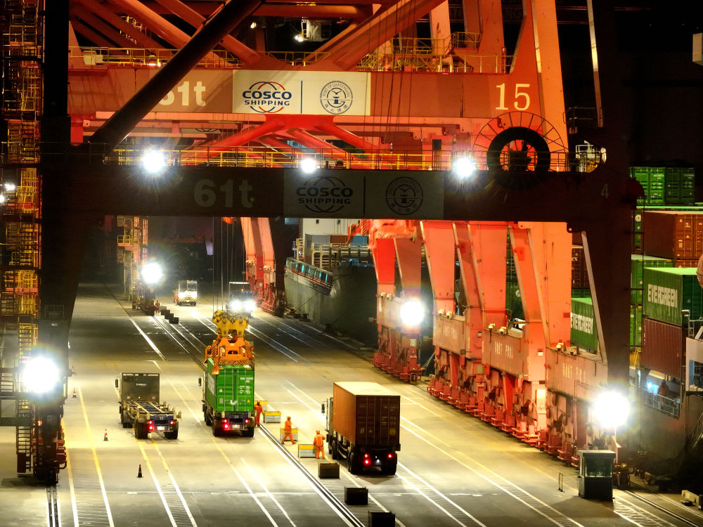 ↑ 2月16日凌晨,江蘇省連云港港集裝箱碼頭燈火通明,工作人員在運(yùn)輸、裝卸集裝箱(無人機(jī)照片)。新華社發(fā)(王春攝)