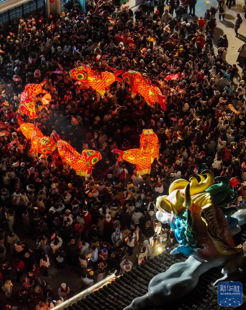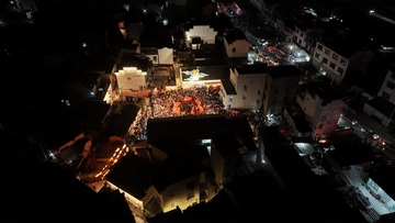 2月7日,瞻淇村魚燈隊(duì)在村中表演(無(wú)人機(jī)照片)。