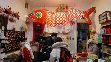 1月29日,在瞻淇村一處店鋪內(nèi),工作人員展示售賣的魚燈冰箱貼。