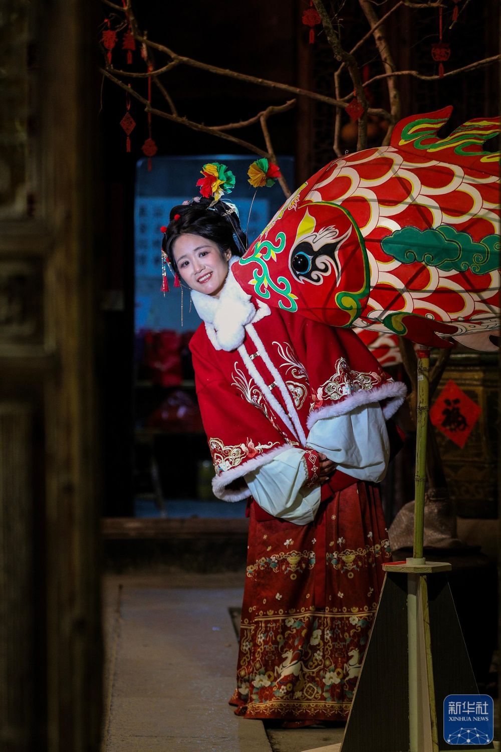 2月7日,游客在瞻淇村和魚燈合影。