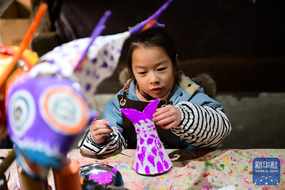 2月8日,小朋友在瞻淇村里體驗(yàn)魚燈制作。