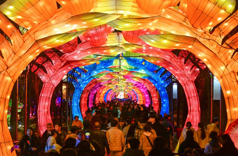 2月19日,游客在河南省洛陽市隋唐城遺址植物園欣賞“神都上元燈會”主題特色燈展。新華社發(fā)(李衛(wèi)超 攝)