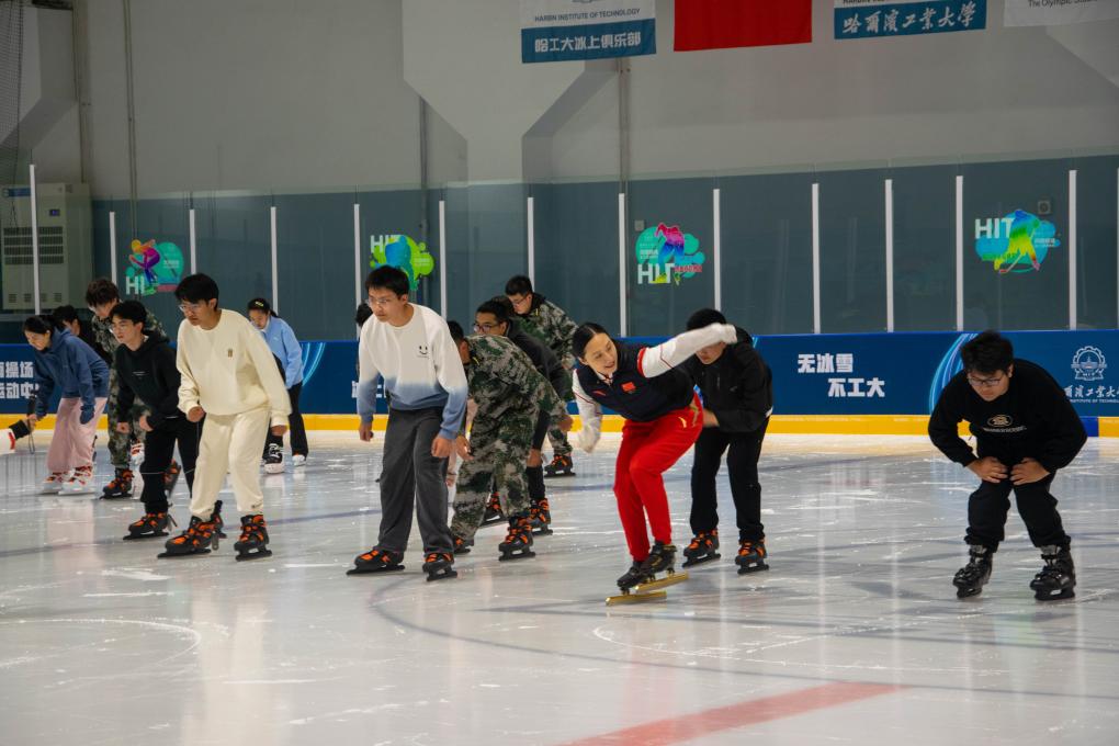 哈爾濱工業(yè)大學(xué)奧林匹克研究中心主任張虹(右三)在哈爾濱工業(yè)大學(xué)教學(xué)生滑冰。(受訪者供圖)