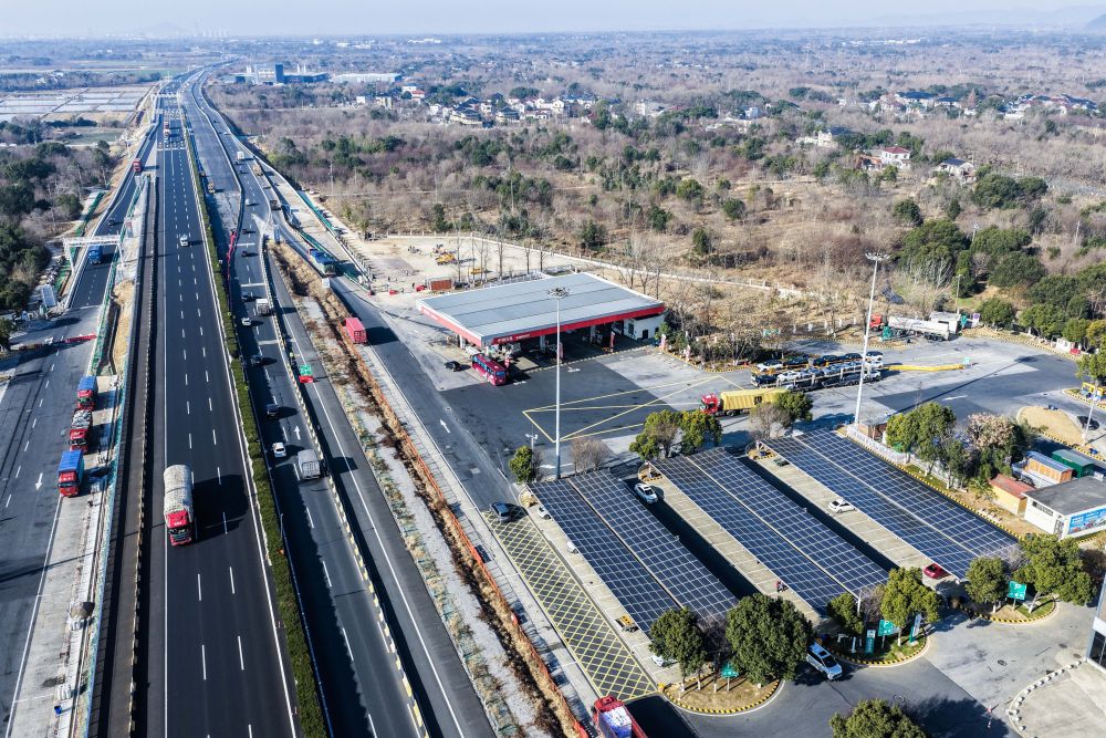 2026年1月7日拍攝的G50滬渝高速長興服務區(qū)(無人機照片)。太陽能光伏板下是升級完成的高速服務區(qū)充電站。新華社記者 徐昱 攝