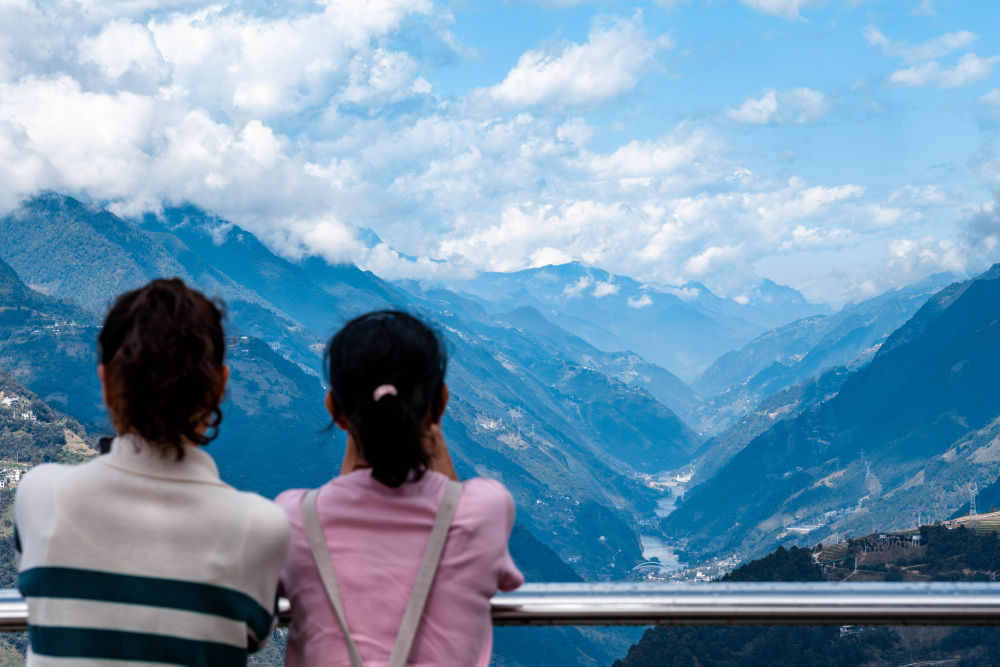 2025年10月20日,游客在云南省福貢縣匹河怒族鄉(xiāng)老姆登村的觀景臺拍攝怒江大峽谷風光。新華社記者 胡超 攝