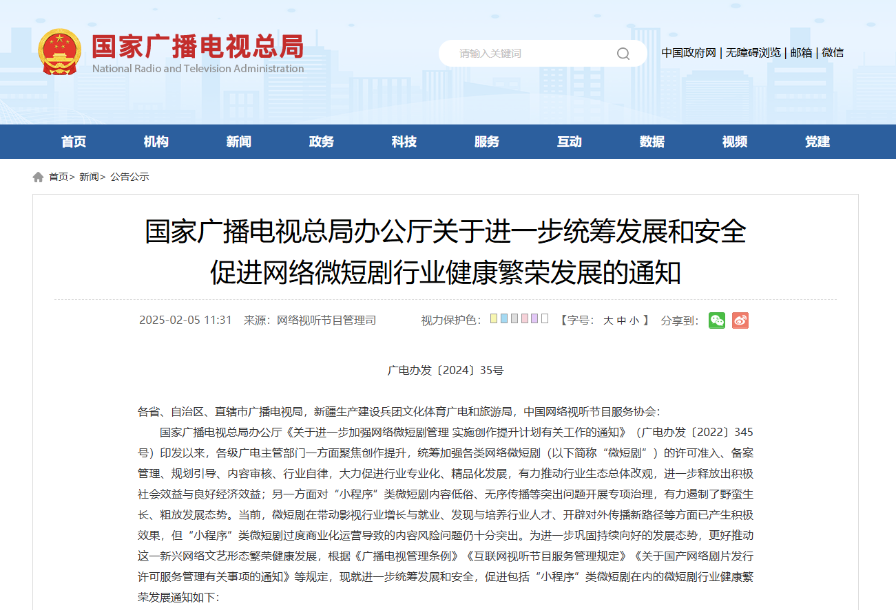 國家廣播電視總局辦公廳發(fā)布《關(guān)于進(jìn)一步統(tǒng)籌發(fā)展和安全促進(jìn)網(wǎng)絡(luò)微短劇行業(yè)健康繁榮發(fā)展的通知》