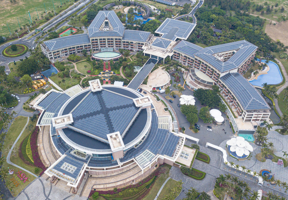 圖為博鰲亞洲論壇國(guó)際會(huì)議中心和博鰲亞洲論壇大酒店屋頂?shù)墓夥O(shè)備(2025年3月16日攝,無(wú)人機(jī)照片)。 新華社記者 蒲曉旭 攝