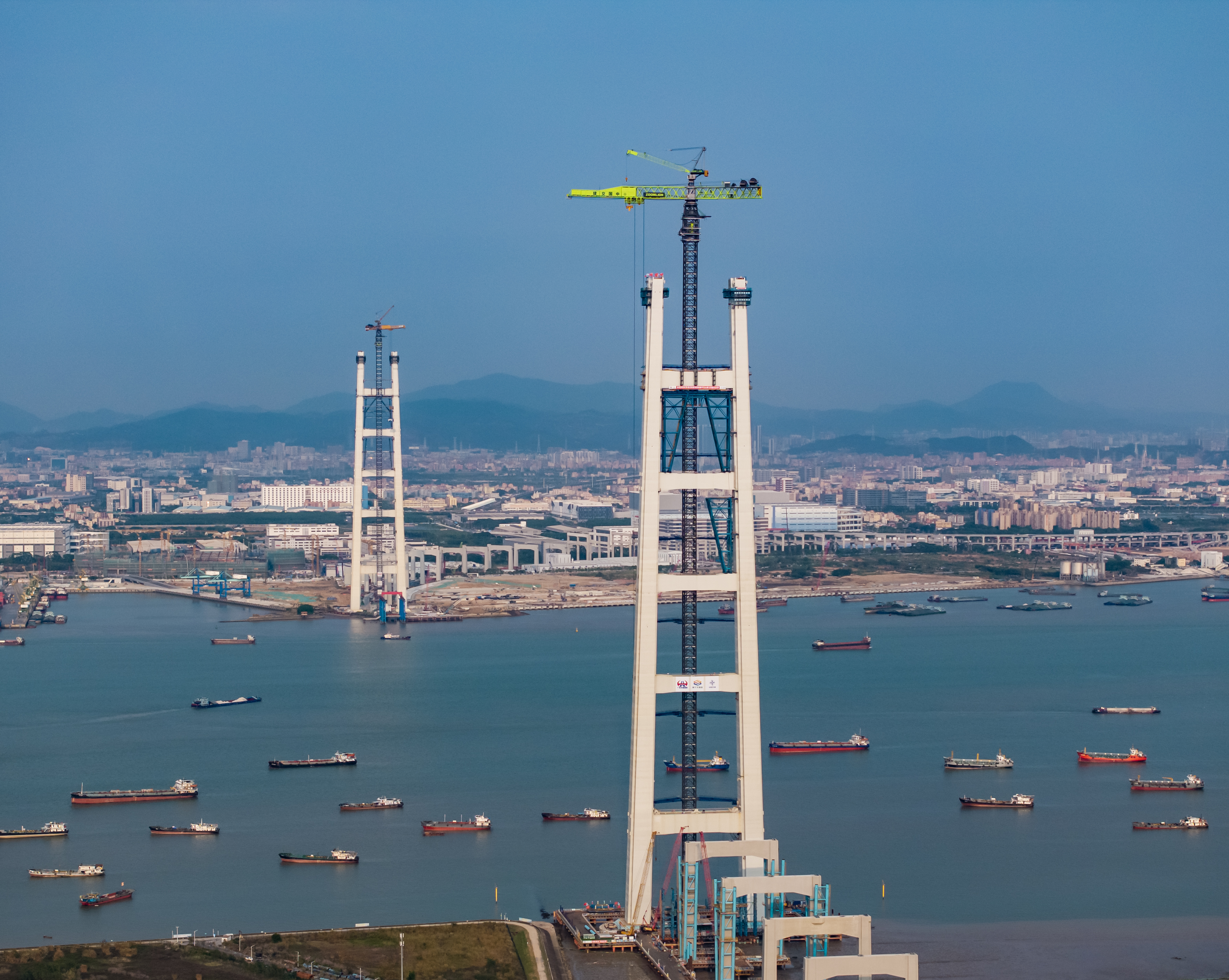 橋塔鋼殼節(jié)段由工廠自動(dòng)化生產(chǎn)線預(yù)制,運(yùn)抵現(xiàn)場(chǎng)后采用全球最大移動(dòng)平衡重塔式起重機(jī)R20000-720吊裝,配合519種碰撞風(fēng)險(xiǎn)算法,保障極端環(huán)境下的毫米級(jí)吊裝。吊裝過(guò)程中,北斗高精度定位系統(tǒng)與云端平臺(tái)實(shí)時(shí)聯(lián)動(dòng),動(dòng)態(tài)采集數(shù)據(jù)、規(guī)劃最優(yōu)路徑,數(shù)據(jù)回傳數(shù)字孿生系統(tǒng)復(fù)核,形成閉環(huán)管控。