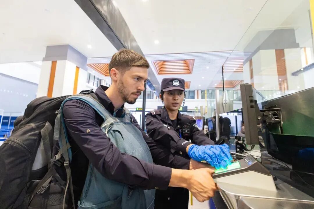 磨憨鐵路口岸的工作人員幫助外國(guó)旅客使用現(xiàn)代化設(shè)備辦理通關(guān)手續(xù)。
