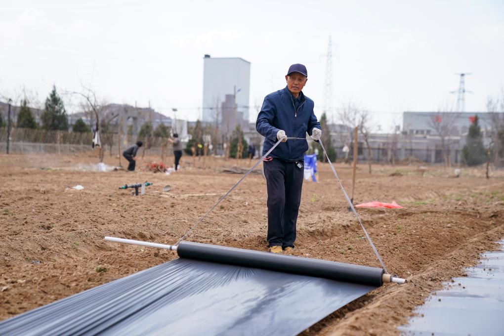 地膜鋪好了,高東元跪在菜畦邊,小心翼翼地用土把邊緣壓實(shí)??粗矍暗牟说?,高東元笑著說:“清明過后,菜椒、茄子就都可以種了?!彼难凵窭铮M了對歲稔年豐的期盼。