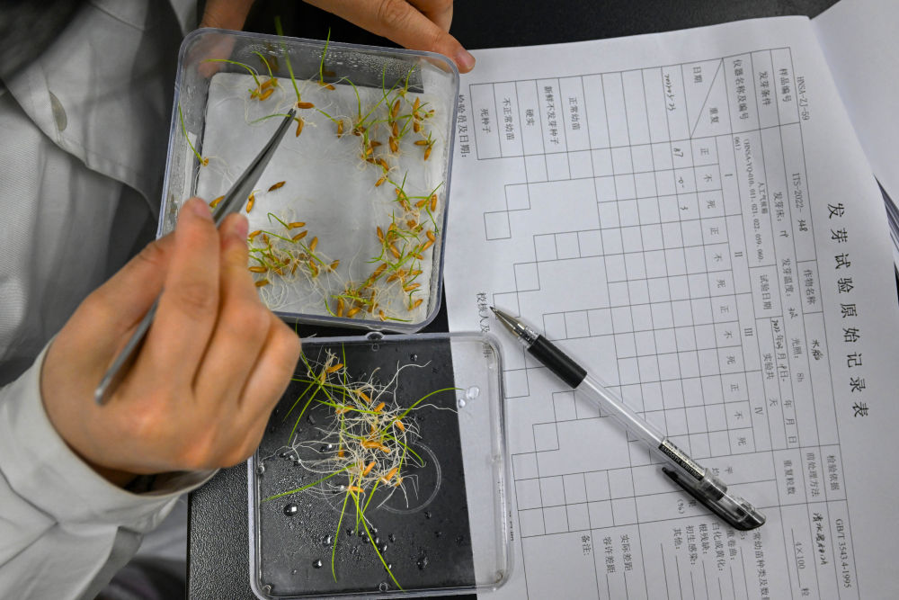 2022年3月23日,在湖南省農(nóng)作物種質(zhì)資源庫實驗室,檢測員對保存的水稻種子進行發(fā)芽試驗檢測。