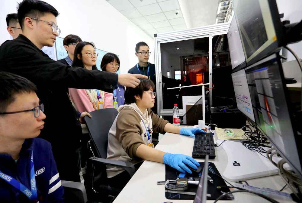 2024年4月10日,安徽省先進(jìn)功能高分子薄膜工程實(shí)驗室團(tuán)隊成員朱健和(左)在上海同步輻射光源實(shí)驗線站向團(tuán)隊成員講解實(shí)驗設(shè)備運(yùn)行情況。