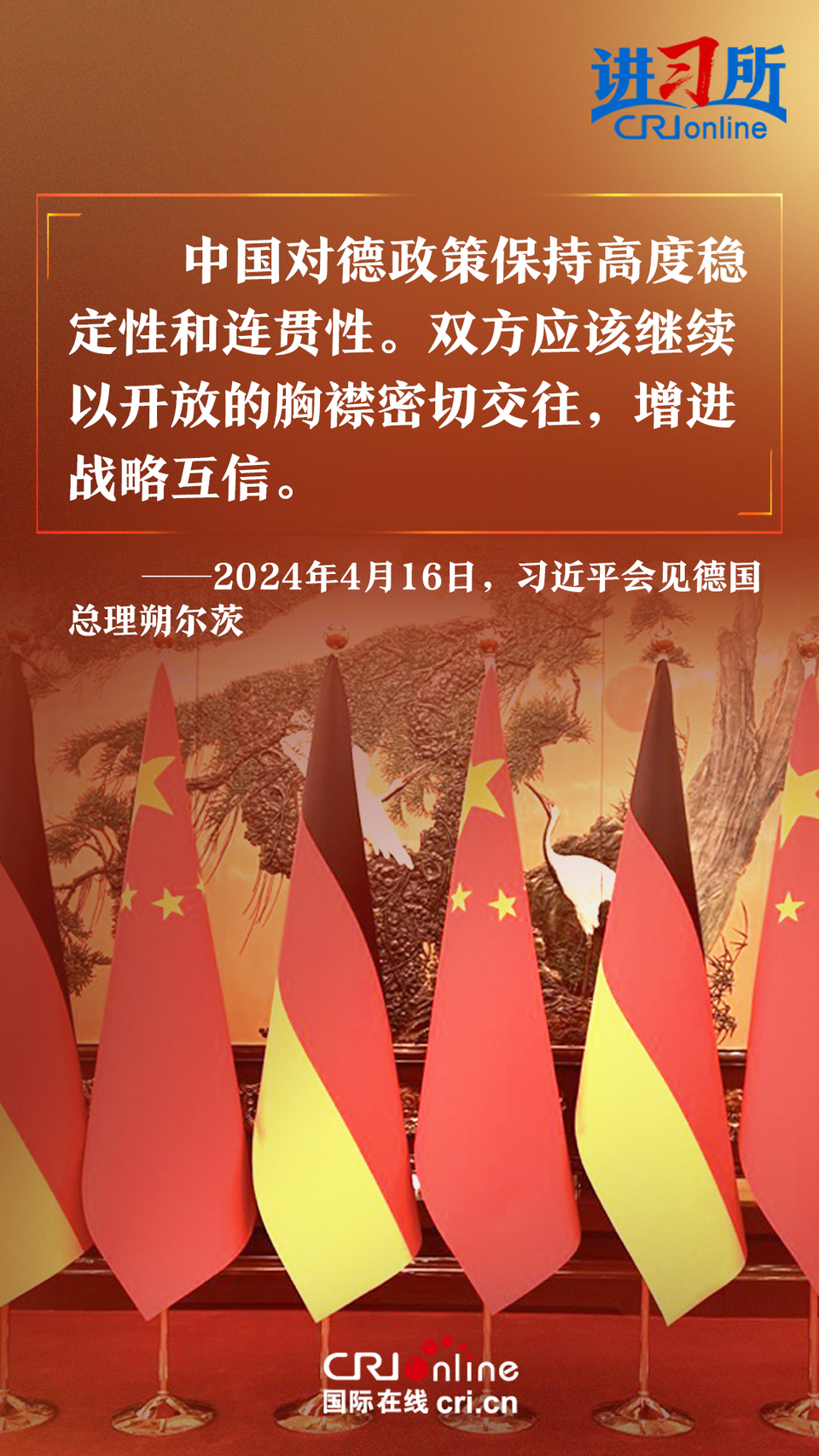 4月16日上午,中國國家主席習近平在北京釣魚臺國賓館會見了德國總理朔爾茨。習近平指出,中德合作對雙方有利,對世界有利。世界越是動蕩,雙方越要提升兩國關系的韌性和活力。中德是世界第二、第三大經濟體,鞏固和發(fā)展中德關系的意義超越雙邊關系范疇,對亞歐大陸乃至整個世界都有重要影響。兩國要從長遠和戰(zhàn)略角度看待和發(fā)展雙邊關系,攜手為世界注入更多穩(wěn)定性和確定性。