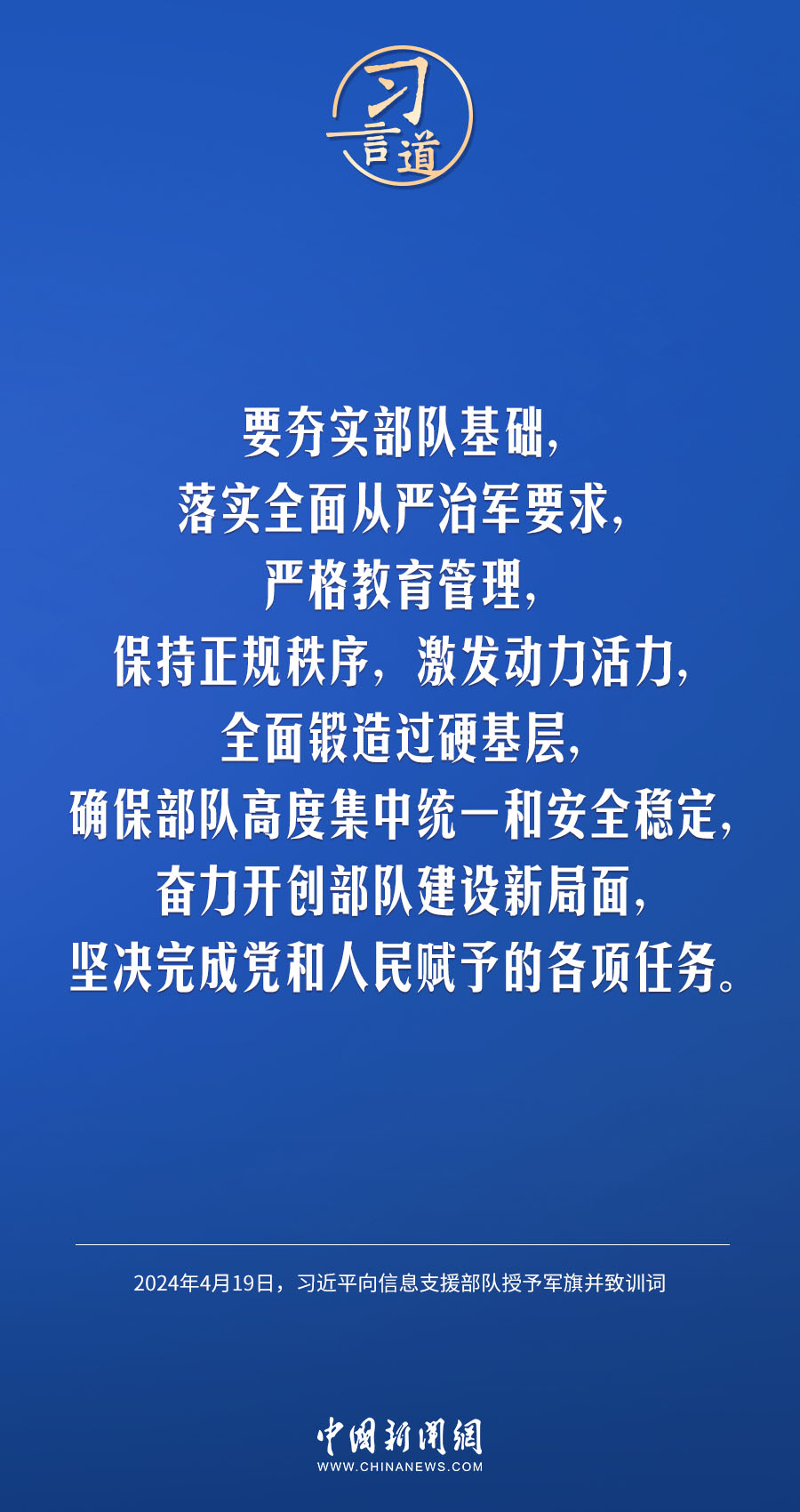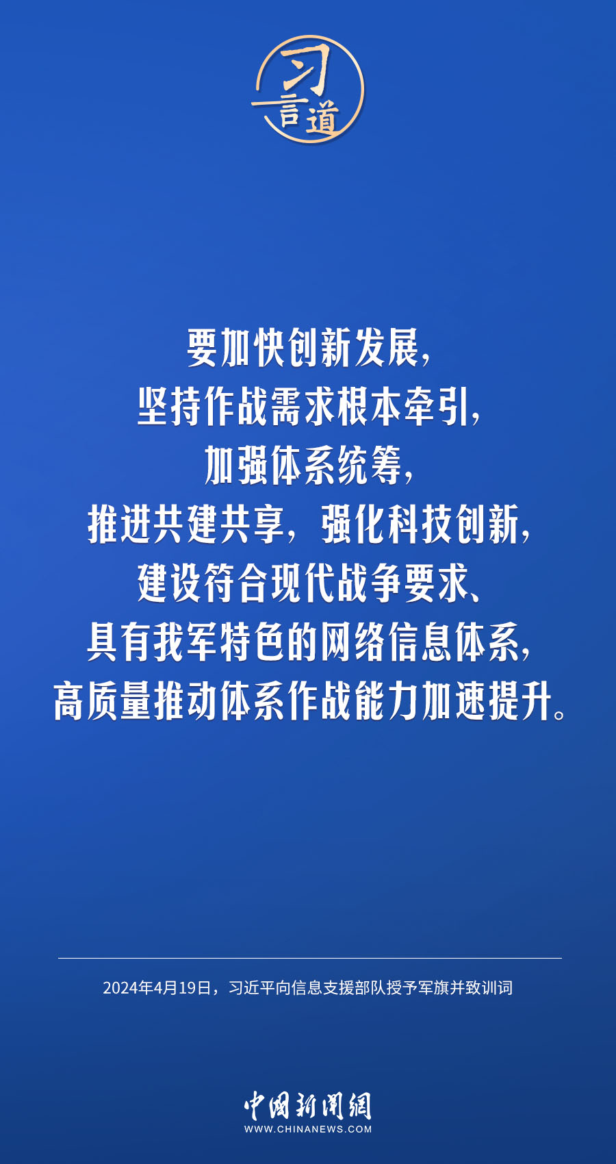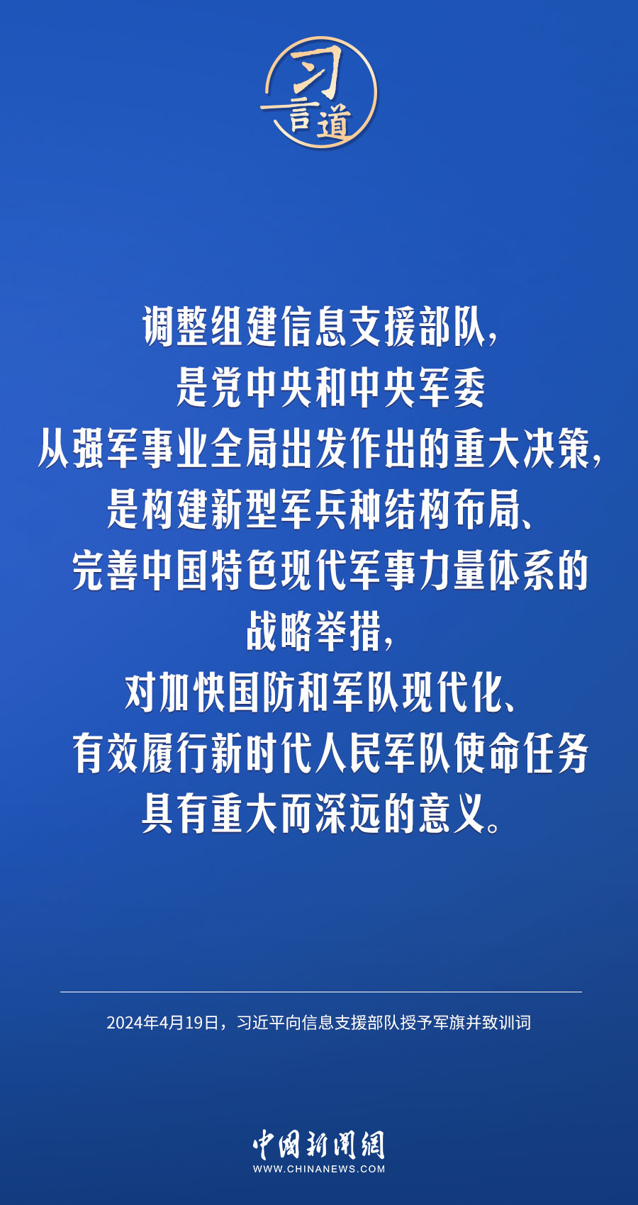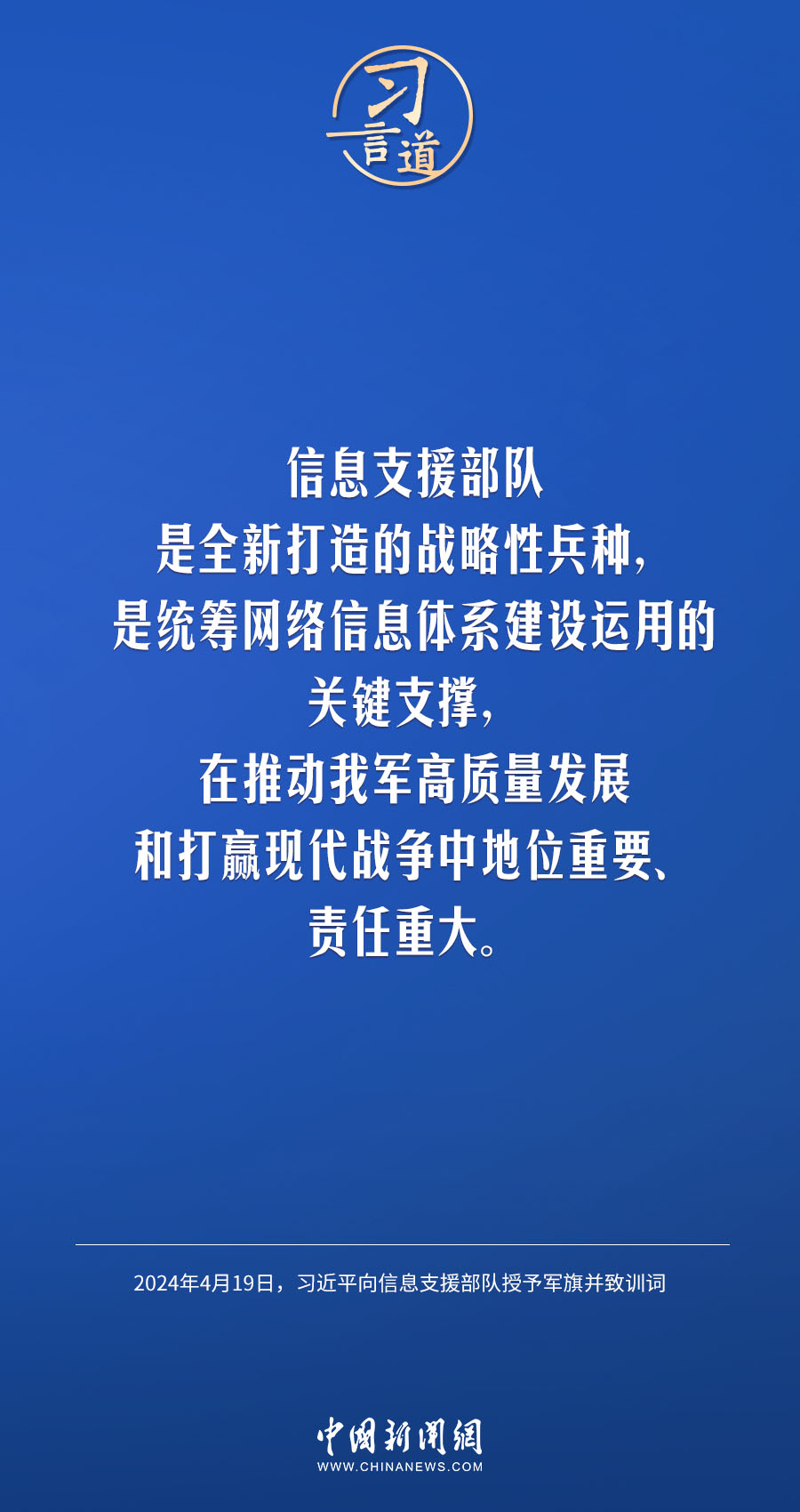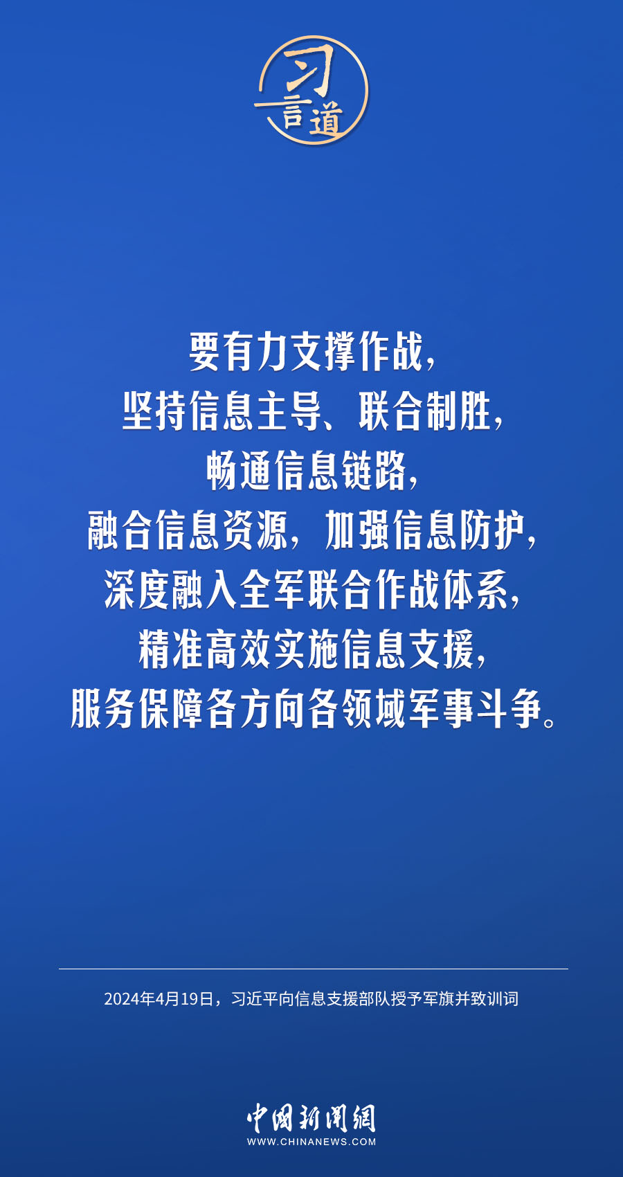 中國人民解放軍信息支援部隊(duì)成立大會19日在北京八一大樓隆重舉行。中共中央總書記、國家主席、中央軍委主席習(xí)近平向信息支援部隊(duì)授予軍旗并致訓(xùn)詞,代表黨中央和中央軍委向信息支援部隊(duì)全體官兵致以熱烈祝賀。他強(qiáng)調(diào)——