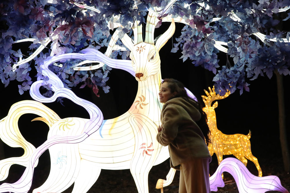 2023年12月14日,一名女子在法國巴黎風(fēng)情園舉辦的“山海有靈”法國豫園燈會(huì)上拍照留念。新華社記者 高靜 攝