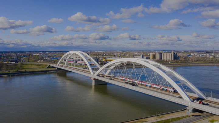2024年3月12日,一列火車運(yùn)行在匈塞鐵路塞爾維亞境內(nèi)貝諾段諾維薩德多瑙河大橋上(無人機(jī)照片)。新華社發(fā)(任衛(wèi)云攝)