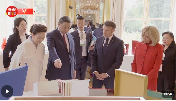 當?shù)貢r間5月6日下午,國家主席習近平在巴黎愛麗舍宮同法國總統(tǒng)馬克龍舉行會談。會談前,習近平向馬克龍贈送圖書。