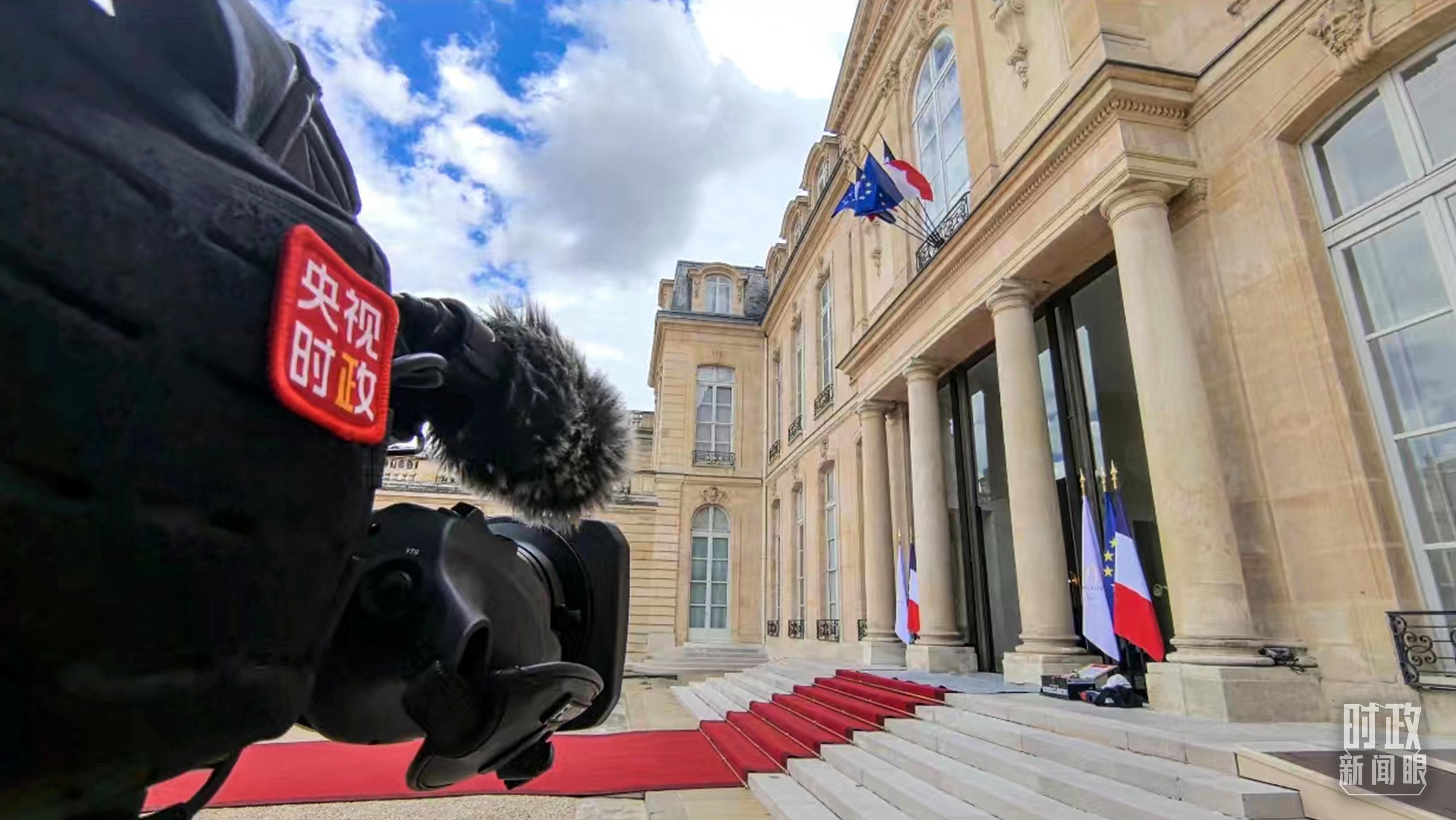 中法歐領(lǐng)導(dǎo)人三方會晤地點(diǎn)——愛麗舍宮懸掛中法兩國國旗。(總臺央視記者劉琦拍攝)