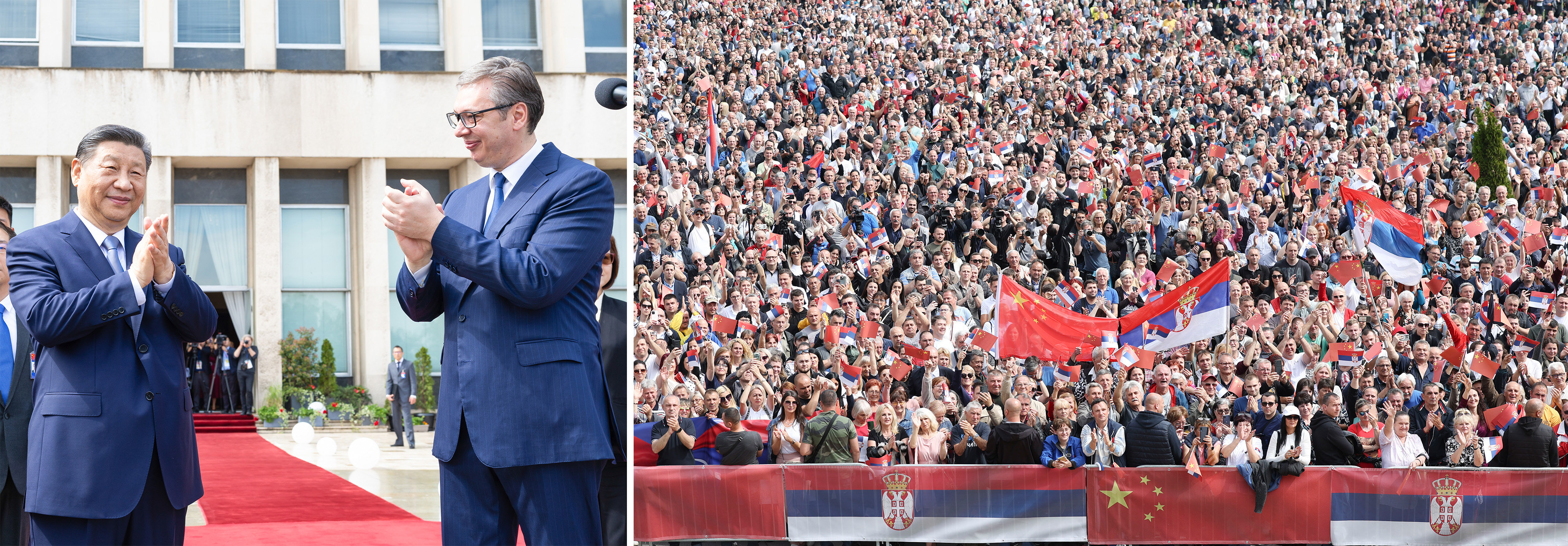 當(dāng)?shù)貢r間2024年5月8日,中塞兩國元首在貝爾格萊德塞爾維亞大廈舉行會談前,武契奇總統(tǒng)陪同習(xí)近平主席來到政府大廈平臺。