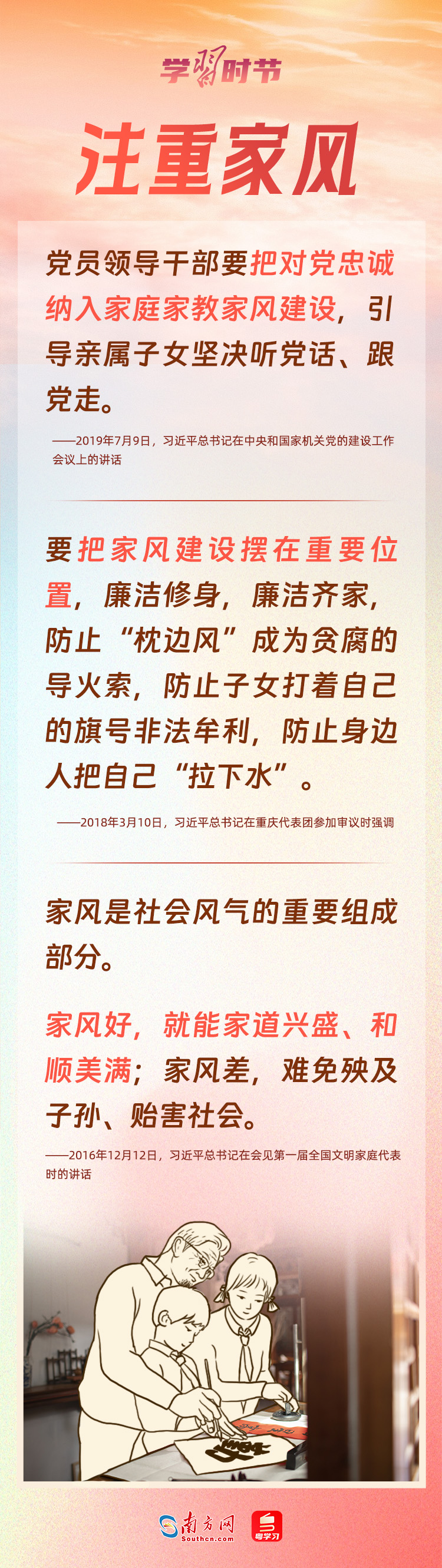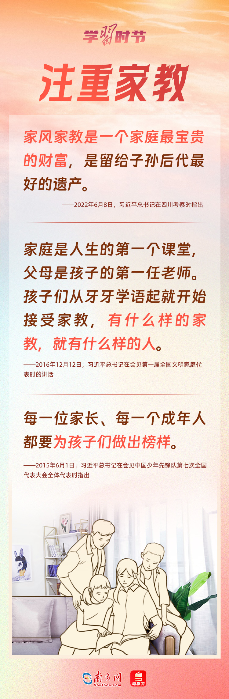 5月15日是國際家庭日。家庭是社會的細胞,是國家發(fā)展、民族進步、社會和諧的重要基點。習近平總書記心中始終牽掛著千家萬戶,高度重視家庭、家教和家風建設,強調不論時代發(fā)生多大變化,不論生活格局發(fā)生多大變化,我們都要重視家庭建設,注重家庭、注重家教、注重家風。家庭和睦、家教良好、家風端正,子女才能健康成長,社會才能健康發(fā)展。
