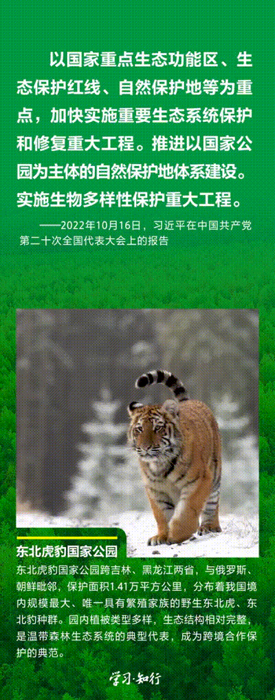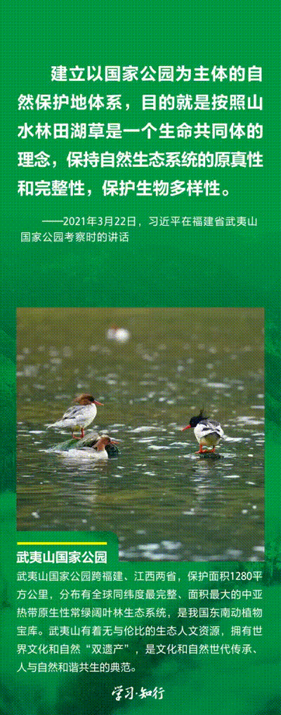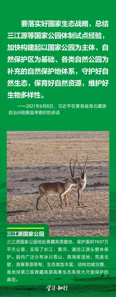 “生物多樣性使地球充滿生機,也是人類生存和發(fā)展的基礎(chǔ)。”推進以國家公園為主體的自然保護地體系建設(shè),是習(xí)近平總書記作出的重要部署。三江源、大熊貓、東北虎豹、海南熱帶雨林、武夷山等首批國家公園正式設(shè)立以來,生態(tài)功能持續(xù)向好,對保護生物多樣性、推進人與自然和諧共生的現(xiàn)代化具有重要意義。