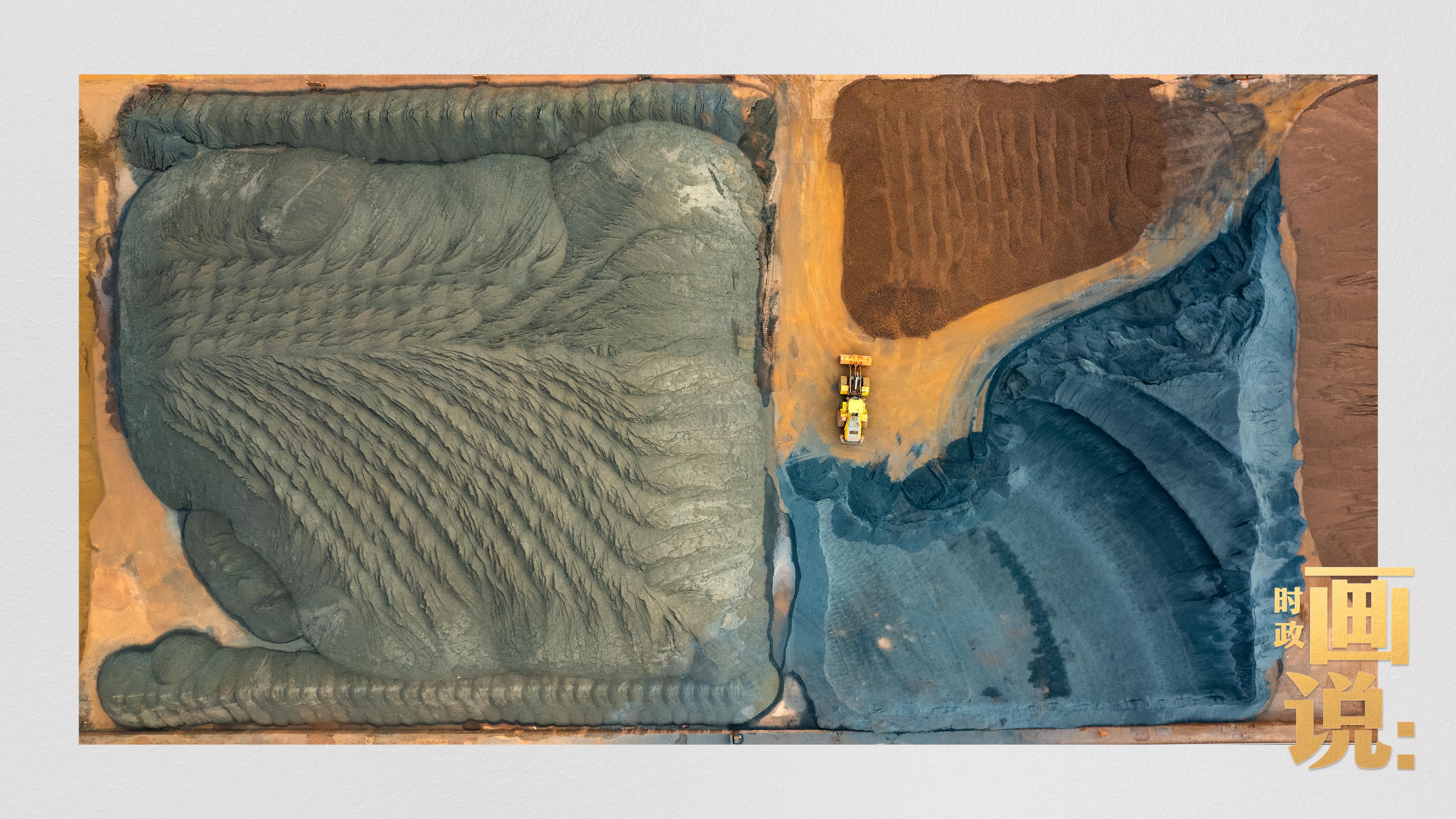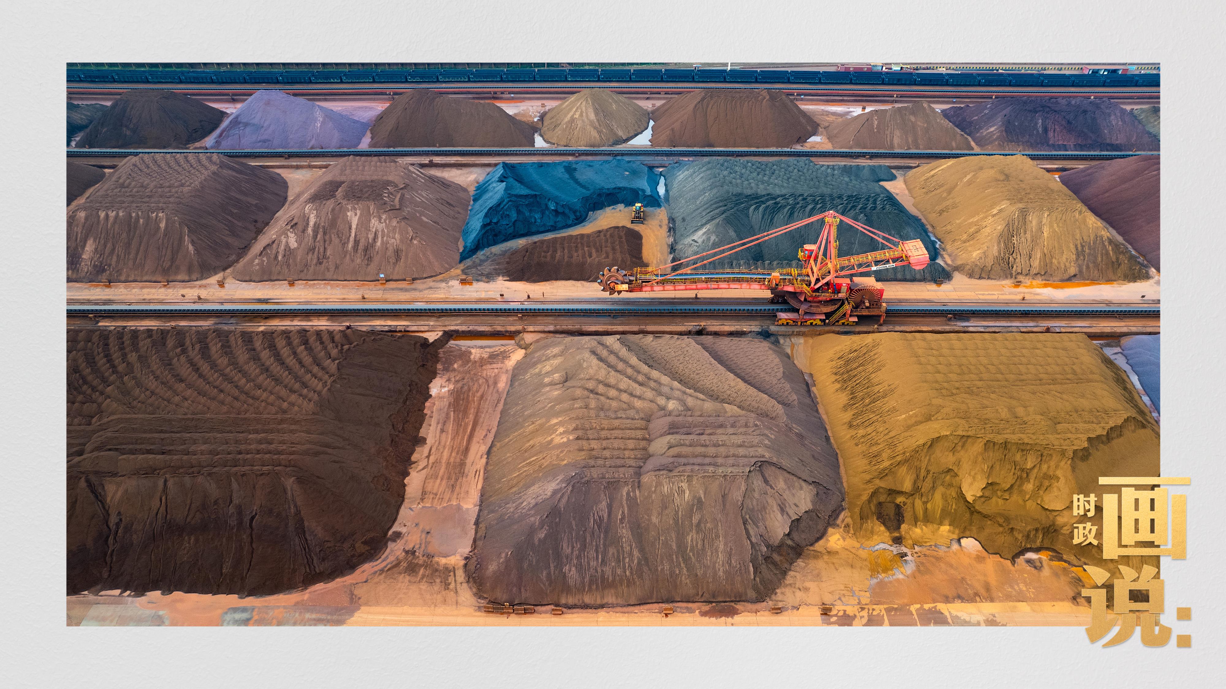 △港區(qū)內(nèi)的礦石堆場(chǎng)整理堆放著五顏六色的各類礦石、礦砂,宛如油畫(huà)。