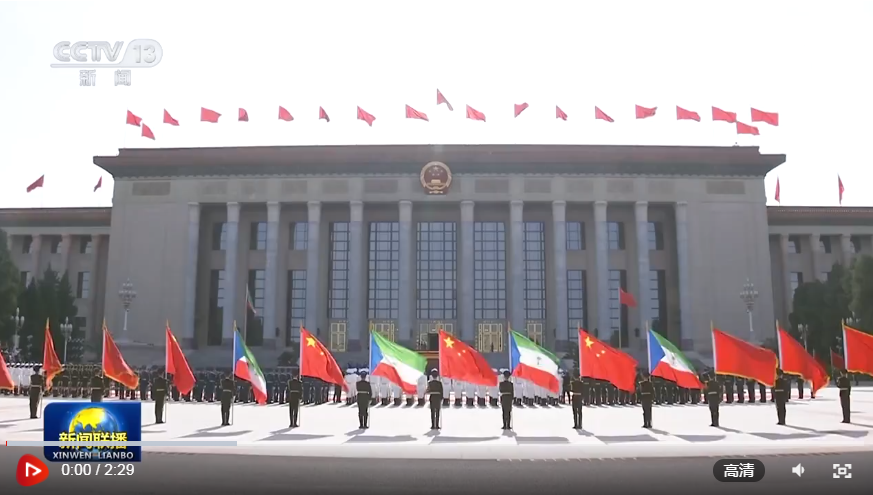 奧比昂抵達(dá)時(shí),禮兵列隊(duì)致敬。兩國(guó)元首登上檢閱臺(tái),軍樂(lè)團(tuán)奏中赤幾兩國(guó)國(guó)歌,天安門(mén)廣場(chǎng)鳴放21響禮炮。奧比昂在習(xí)近平陪同下檢閱中國(guó)人民解放軍儀仗隊(duì),并觀看分列式。