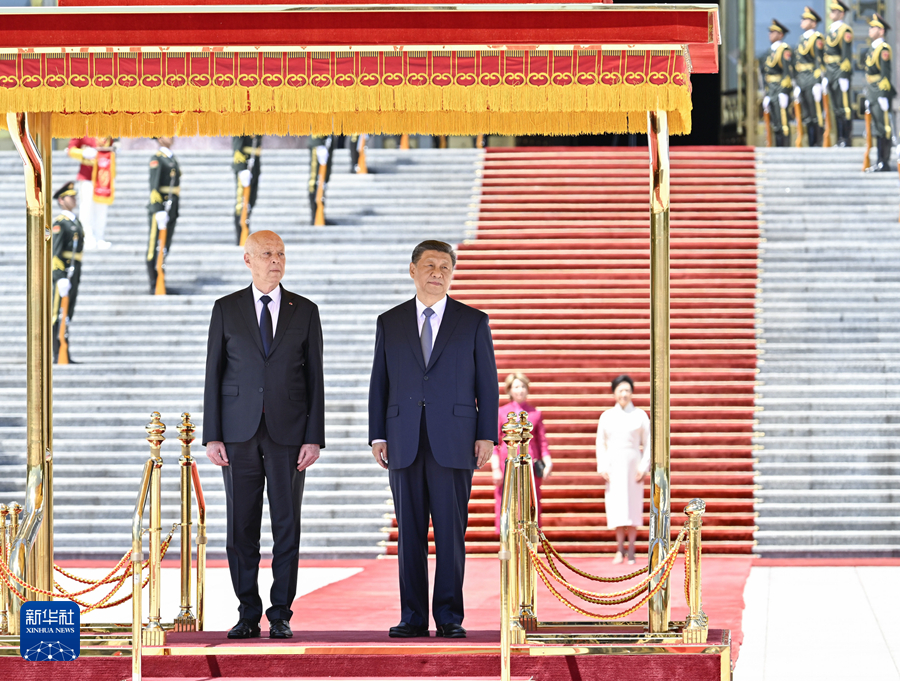 5月31日上午,國(guó)家主席習(xí)近平在北京人民大會(huì)堂同來(lái)華國(guó)事訪問(wèn)并出席中國(guó)-阿拉伯國(guó)家合作論壇第十屆部長(zhǎng)級(jí)會(huì)議開(kāi)幕式的突尼斯總統(tǒng)賽義德舉行會(huì)談。這是會(huì)談前,習(xí)近平在人民大會(huì)堂東門外廣場(chǎng)為賽義德舉行歡迎儀式。新華社記者 丁海濤 攝