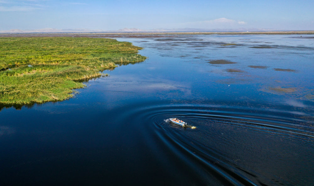 2023年9月15日,河湖濕地水環(huán)境保護與修復(fù)技術(shù)研究團隊在內(nèi)蒙古烏梁素海采集湖水樣本(無人機照片)。位于黃河“幾字彎”頂部的烏梁素海,是黃河流域最大的湖泊濕地,是控制京津風沙源的天然生態(tài)屏障。近年來,當?shù)夭粩嗉訌姙趿核睾>C合治理力度,生態(tài)環(huán)境持續(xù)好轉(zhuǎn)。