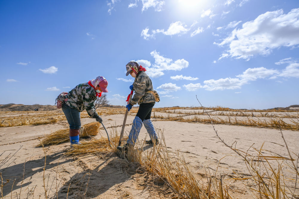 2024年3月28日,治沙工人在內(nèi)蒙古通遼市科爾沁左翼后旗阿古拉鎮(zhèn)的沙地里打草方格。