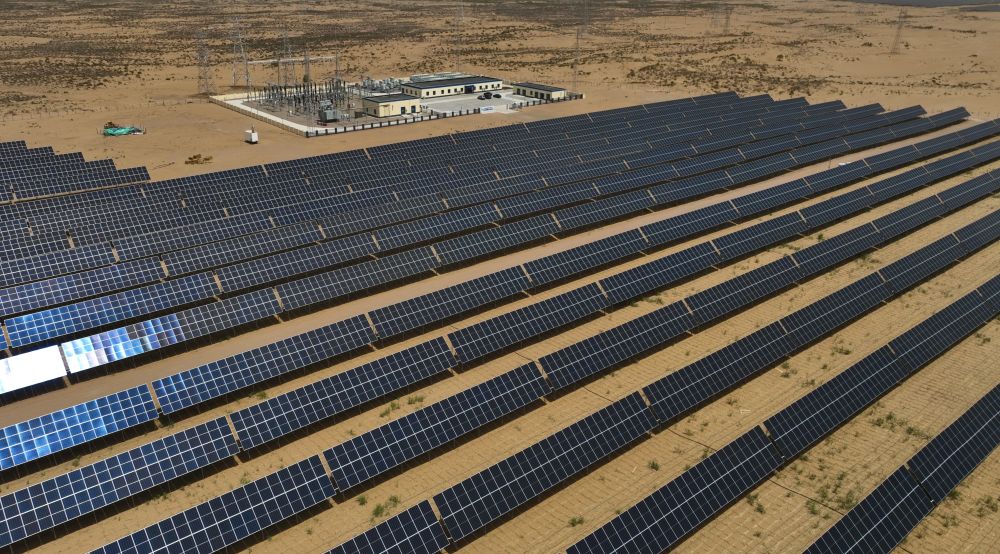 2024年5月16日在內(nèi)蒙古巴彥淖爾市磴口縣拍攝的烏蘭布和沙漠光伏基地(無人機照片)。烏蘭布和沙漠建設(shè)生態(tài)光伏基地,采取板上發(fā)電、板下種植的辦法,努力把沙海變?yōu)椤熬G?!?。