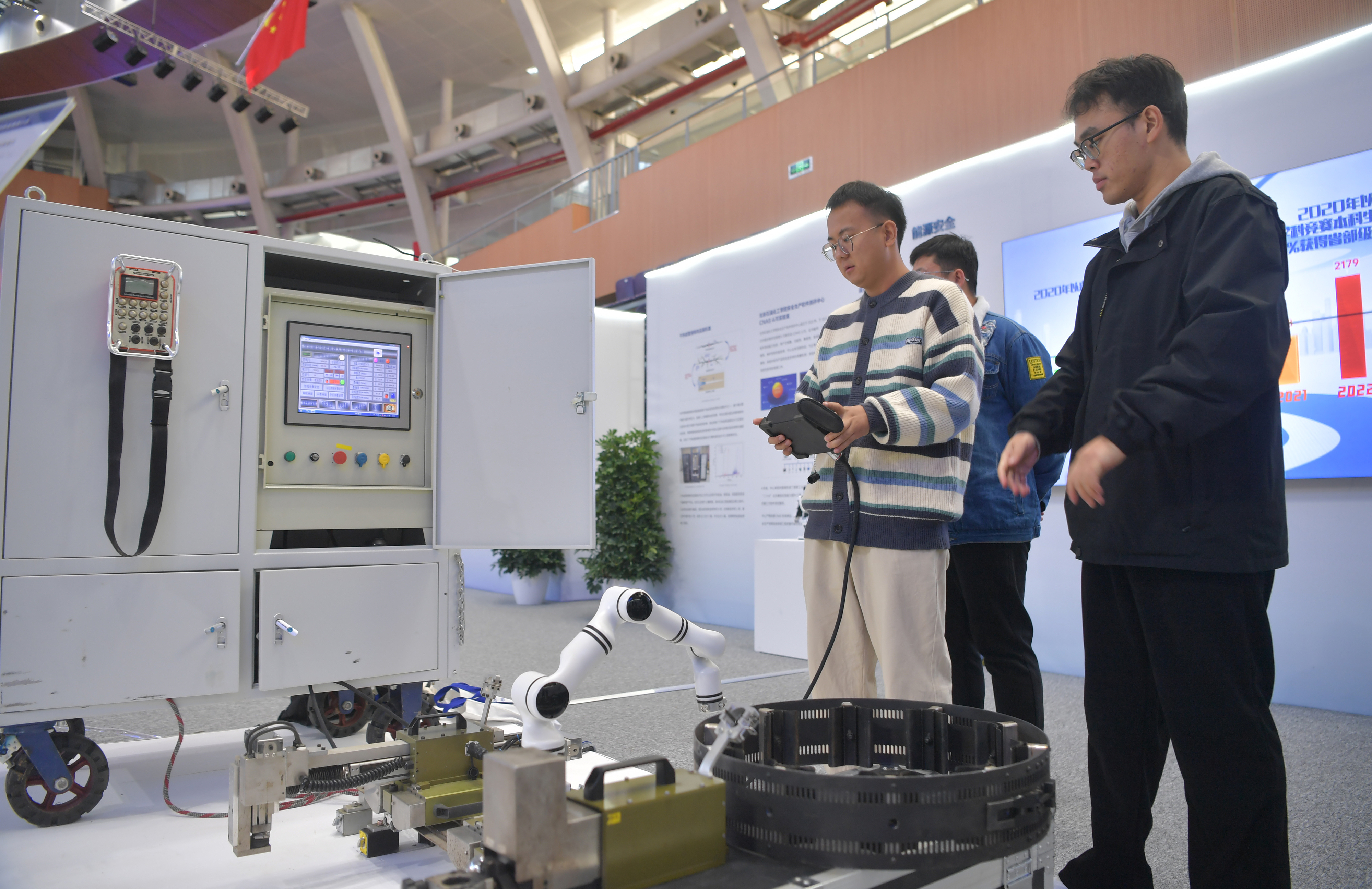 2023年,京南地區(qū)高??萍汲晒平闀诒本┙ㄖ髮W大興校區(qū)舉行。圖為高校師生在展示管道全位置焊接機器人系統(tǒng)成果。