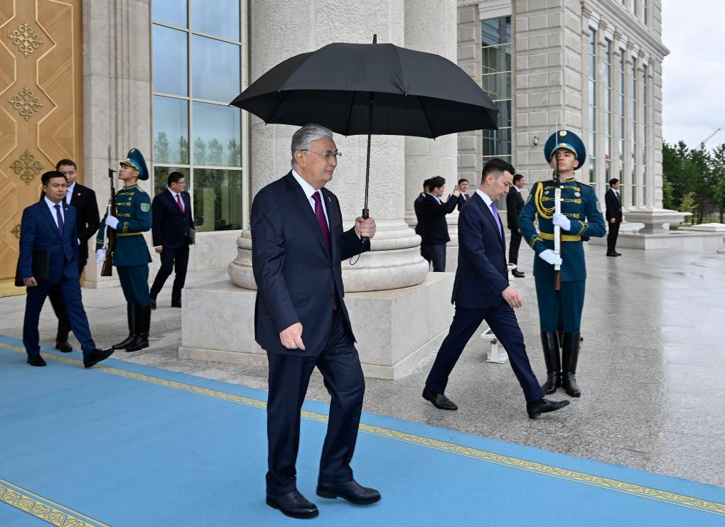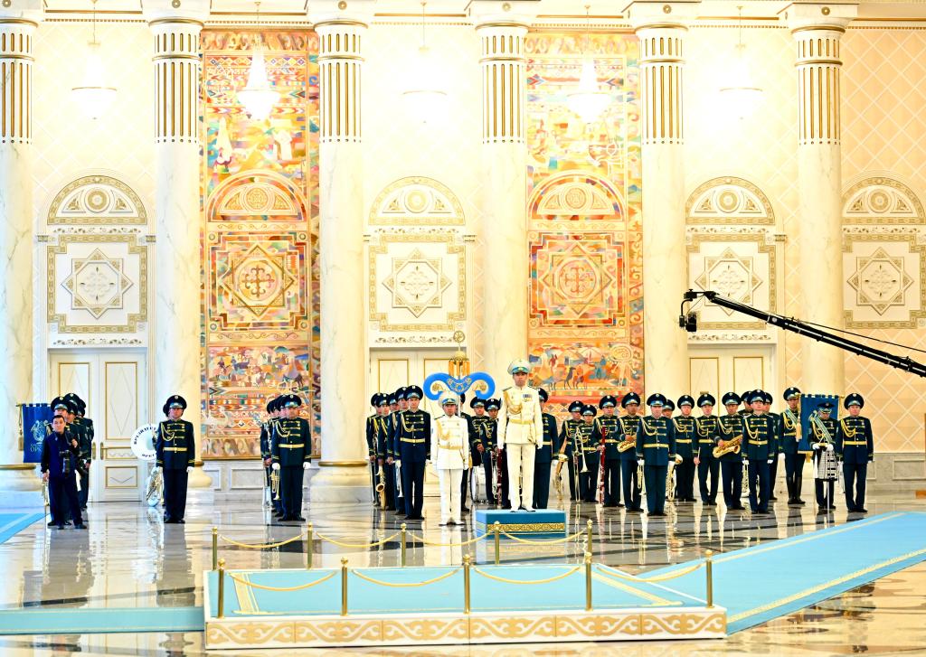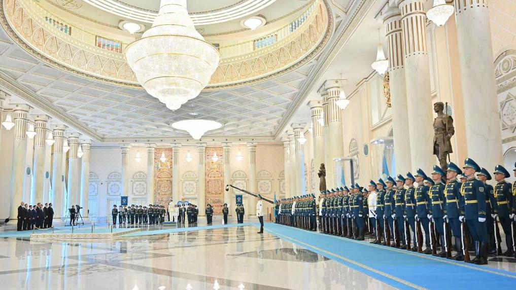 托卡耶夫?yàn)榱?xí)近平舉行隆重歡迎儀式。總統(tǒng)府大廳氣勢(shì)恢宏,禮兵威武挺拔。兩國(guó)元首分別同對(duì)方陪同人員一一握手致意。兩國(guó)元首登上檢閱臺(tái),軍樂團(tuán)奏中哈兩國(guó)國(guó)歌。習(xí)近平在托卡耶夫陪同下檢閱儀仗隊(duì)。