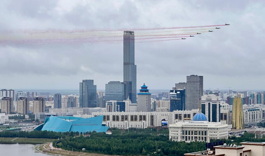 當(dāng)?shù)貢r(shí)間7月3日,國(guó)家主席習(xí)近平在阿斯塔納出席哈薩克斯坦總統(tǒng)托卡耶夫舉行的歡迎儀式。習(xí)近平乘車抵達(dá)總統(tǒng)府時(shí),托卡耶夫總統(tǒng)熱情迎接。六架哈薩克斯坦空軍戰(zhàn)機(jī)從總統(tǒng)府上空飛過,拉出象征中國(guó)國(guó)旗的紅黃色彩煙,以最高禮儀歡迎習(xí)近平對(duì)哈薩克斯坦進(jìn)行國(guó)事訪問。