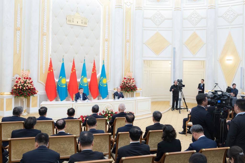 習(xí)近平在阿斯塔納總統(tǒng)府同托卡耶夫共同會(huì)見記者。