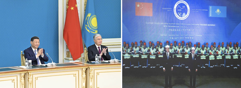 中午,習(xí)近平同托卡耶夫在阿斯塔納總統(tǒng)府以視頻方式共同出席中歐跨里海直達(dá)快運(yùn)開通儀式。哈方項(xiàng)目負(fù)責(zé)人向兩國元首匯報(bào)準(zhǔn)備情況,中方項(xiàng)目負(fù)責(zé)人請兩國元首下達(dá)指令。兩國元首共同下達(dá)作業(yè)指令:“啟運(yùn)!”兩國元首通過大屏幕觀看車輛登船、集裝箱裝船等實(shí)時(shí)情況?,F(xiàn)場響起熱烈掌聲。