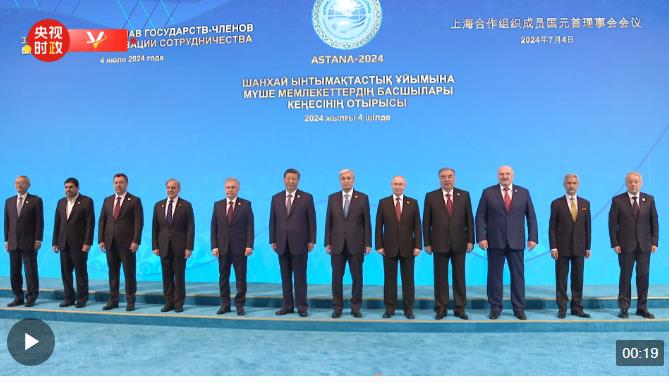 當?shù)貢r間7月4日上午,國家主席習近平在阿斯塔納獨立宮出席上海合作組織成員國元首理事會第二十四次會議。習近平同上海合作組織成員國領導人集體合影。