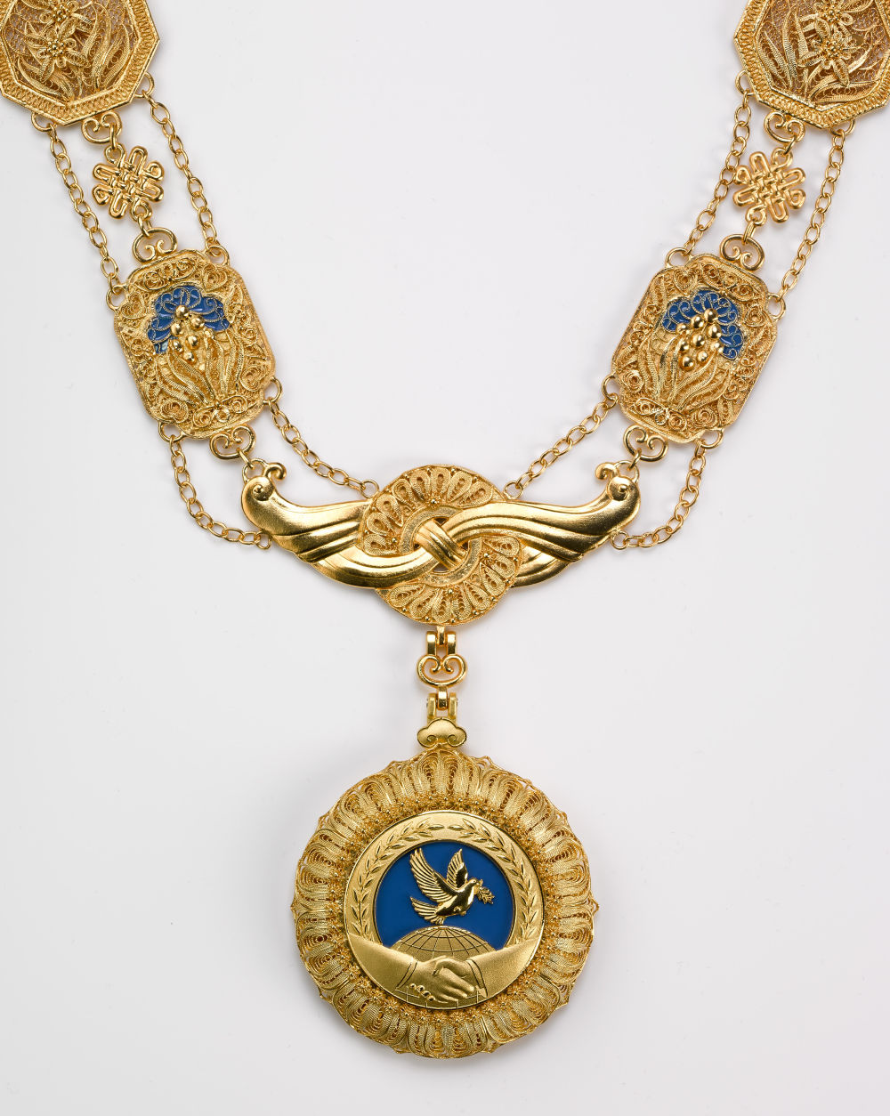 “友誼勛章”章體以金色、藍(lán)色為主色調(diào),采用和平鴿、地球、握手、荷花等元素,章鏈采用中國(guó)結(jié)、萬年青、牡丹花、玉璧、蘭草等元素,整體采用花絲鑲嵌、掐絲琺瑯等傳統(tǒng)工藝手工制作。設(shè)計(jì)制作象征中國(guó)人民同各國(guó)人民友好團(tuán)結(jié)、友誼長(zhǎng)存,祝愿世界各國(guó)共同繁榮發(fā)展。