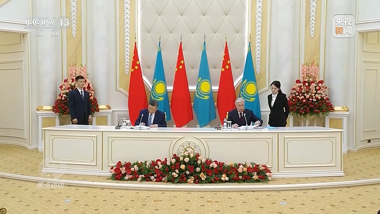 兩國元首共同簽署《中華人民共和國和哈薩克斯坦共和國聯(lián)合聲明》,見證簽署數(shù)十項(xiàng)合作文件并共同出席兩國文化中心和北京語言大學(xué)哈薩克斯坦分校揭牌儀式。