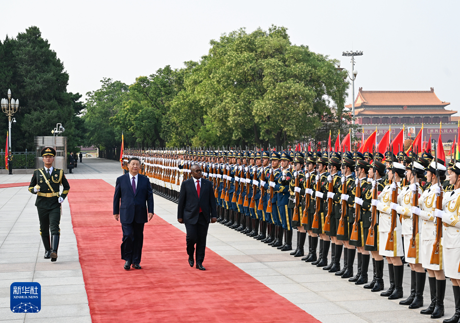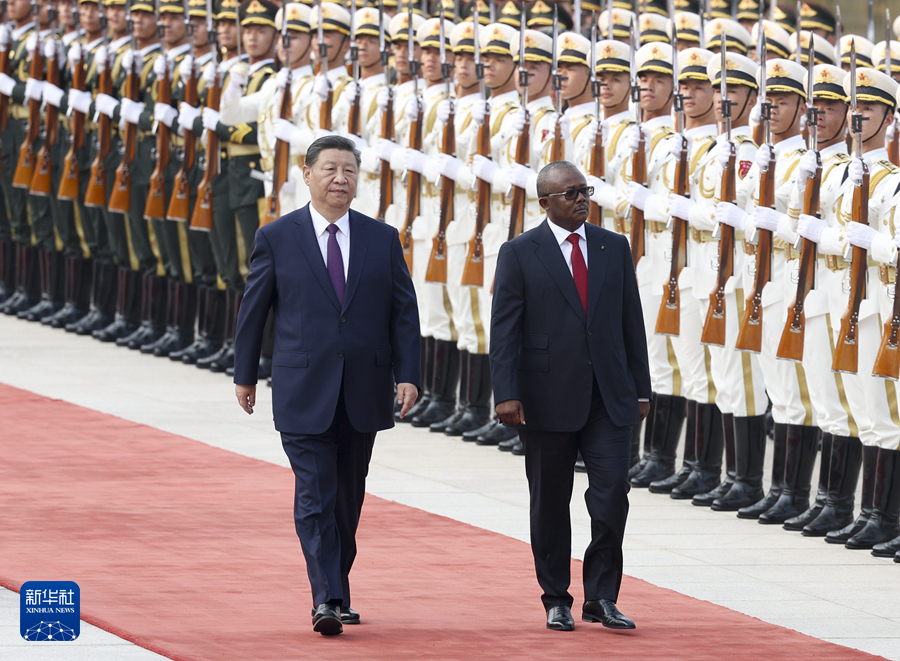 7月10日下午,國家主席習(xí)近平在北京人民大會堂同來華進行國事訪問的幾內(nèi)亞比紹總統(tǒng)恩巴洛舉行會談。這是會談前,習(xí)近平在人民大會堂東門外廣場為恩巴洛舉行歡迎儀式。新華社記者 饒愛民 攝