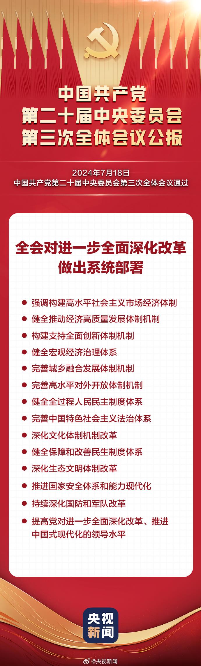 中國(guó)共產(chǎn)黨第二十屆中央委員會(huì)第三次全體會(huì)議于2024年7月15日至18日在北京舉行,全會(huì)對(duì)進(jìn)一步全面深化改革做出系統(tǒng)部署,強(qiáng)調(diào)構(gòu)建高水平社會(huì)主義市場(chǎng)經(jīng)濟(jì)體制,健全推動(dòng)經(jīng)濟(jì)高質(zhì)量發(fā)展體制機(jī)制,構(gòu)建支持全面創(chuàng)新體制機(jī)制,健全宏觀經(jīng)濟(jì)治理體系,完善城鄉(xiāng)融合發(fā)展體制機(jī)制,完善高水平對(duì)外開放體制機(jī)制,健全全過(guò)程人民民主制度體系,完善中國(guó)特色社會(huì)主義法治體系,深化文化體制機(jī)制改革,健全保障和改善民生制度體系,深化生態(tài)文明體制改革,推進(jìn)國(guó)家安全體系和能力現(xiàn)代化,持續(xù)深化國(guó)防和軍隊(duì)改革,提高黨對(duì)進(jìn)一步全面深化改革、推進(jìn)中國(guó)式現(xiàn)代化的領(lǐng)導(dǎo)水平。